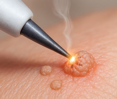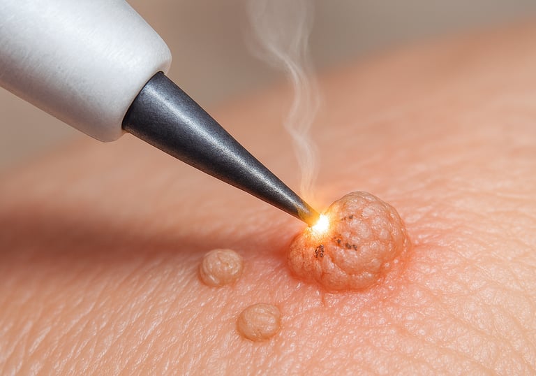 Biopsias, remoção cirúrgica, eletrocauterização de lesões, lesões queloideanas e cuidados pós-operatório de cicatrizes.